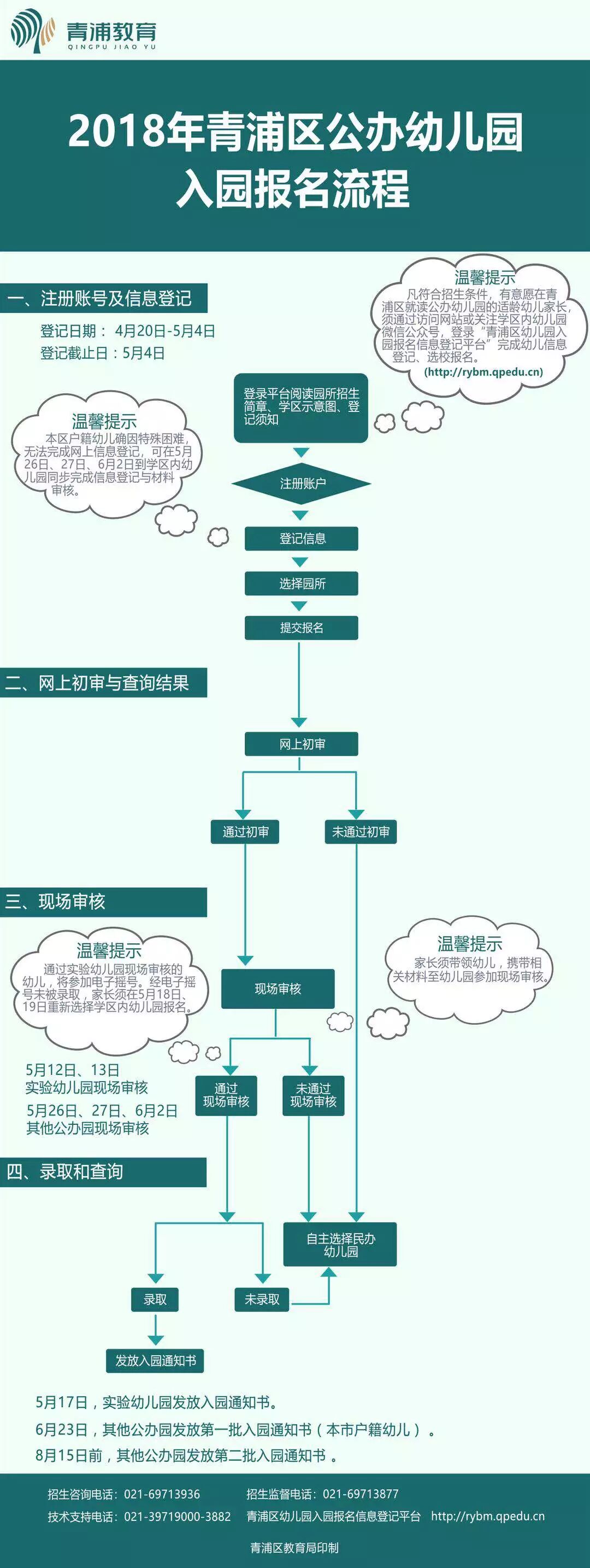 凡符合招生条件的适龄幼儿家长,须在2018年4月20日-5月4日,通过访问网站(http://rybm.qpedu.cn)或关注学区内幼儿园微信公众号,登录平台完成幼儿信息登记,按照学区示意图、各园招生简章的条件选校报名,并按短信提示进行后续现场材料审核、查询招生进度。每名幼儿限报学区内1所幼儿园,5月4日为网上信息登记截止日。